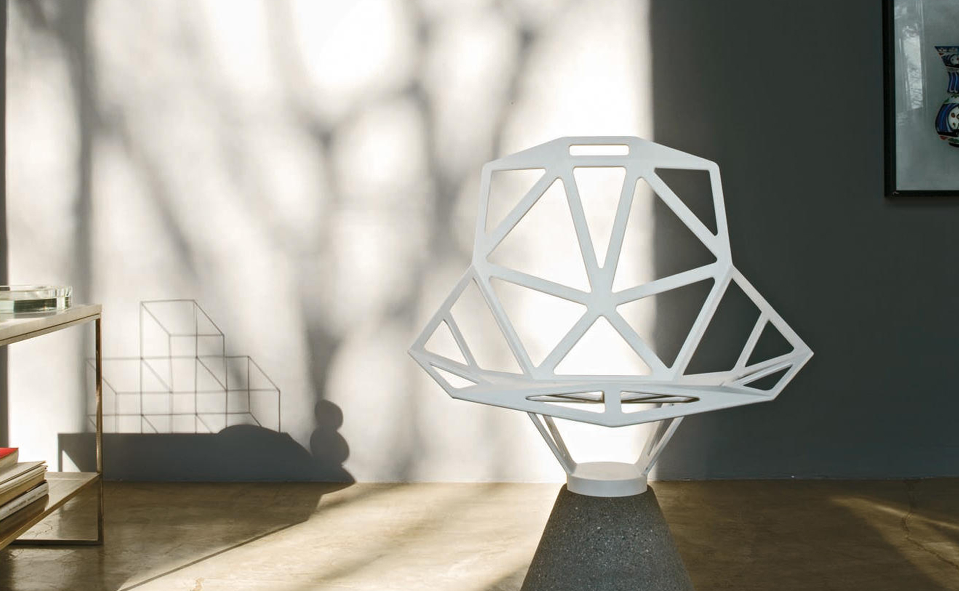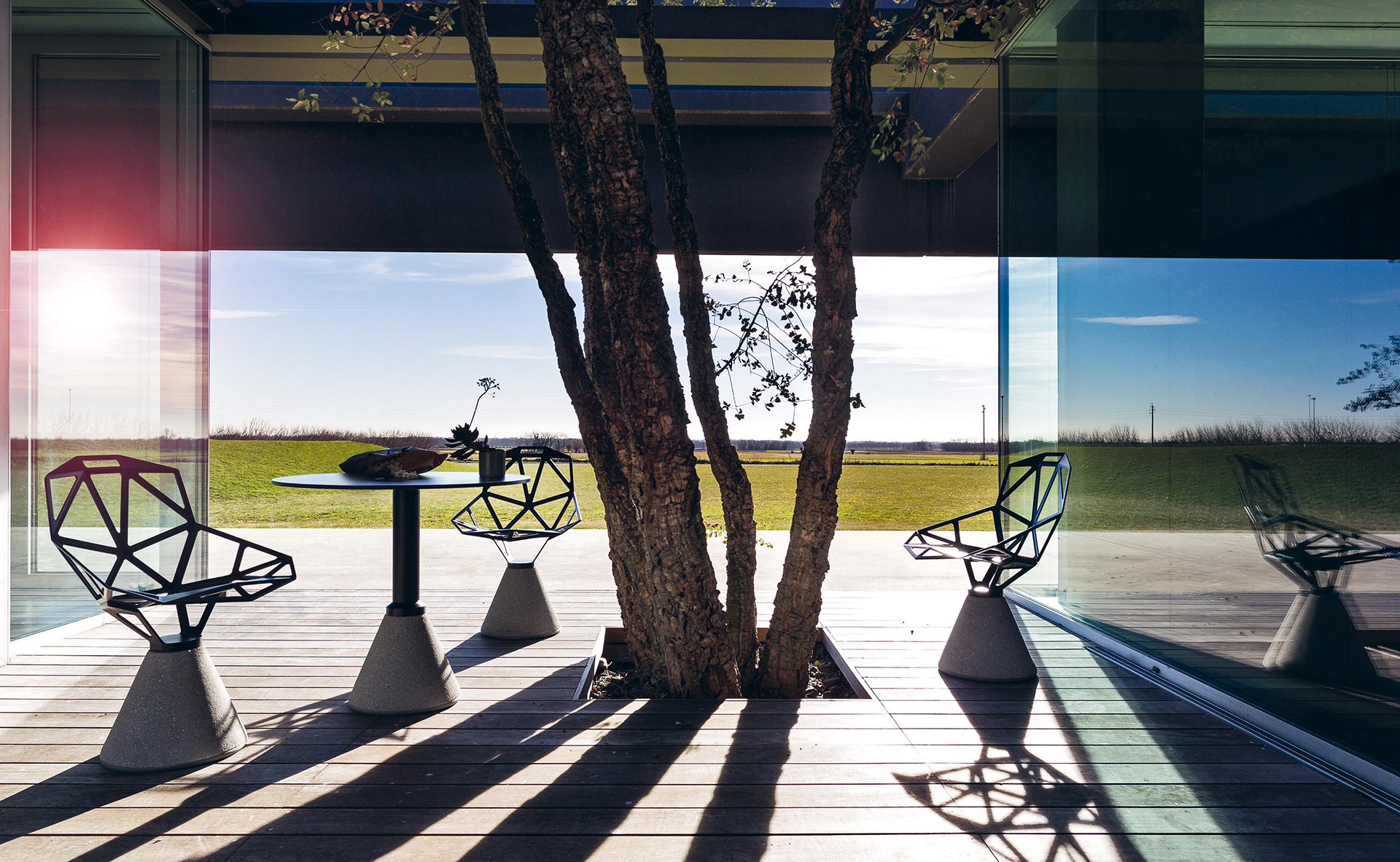 Chair One from Magis is a truly unique seat designed by Konstantin Grcic. The shell is a structure of flat geometric shapes that join up around the edges, like a soccer ball. The shape was the fruit of lengthy preparatory studies, using sketches, cardboard models and prototypes before moving on to production in die-cast aluminium. The chair comes in a choice of finishes: it may be polished for truly durable brilliance, treated with sputtered, fluorinated titanium, or painted for outdoor use. It is available in two versions: a stackable chair with aluminium profile legs, which may be polished, anodized or painted, to meet any needs for home, contract or outdoor settings; or a fixed or swivel chair with a cement base painted transparent that enhances its pleasingly rough texture, typical of contemporary art and architecture.