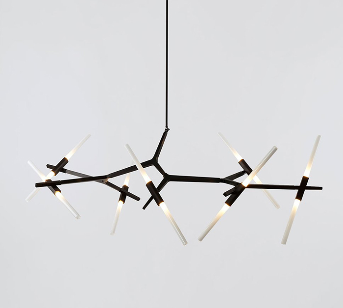 Originally conceived as a candelabra, Agnes introduced by Roll & Hill, takes its inspiration from the fictional heroine of the same name, a worker in the world's oldest profession during the 1849 California Gold Rush. The modular system would allow Agnes easy setup in her makeshift "workspace." In this version, glowing glass tubes replace the candles. Articulated joints allow the glass to be arranged in a multitude of ways. Designed by Lindsey Adelman.