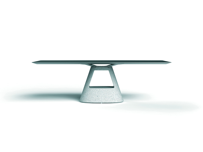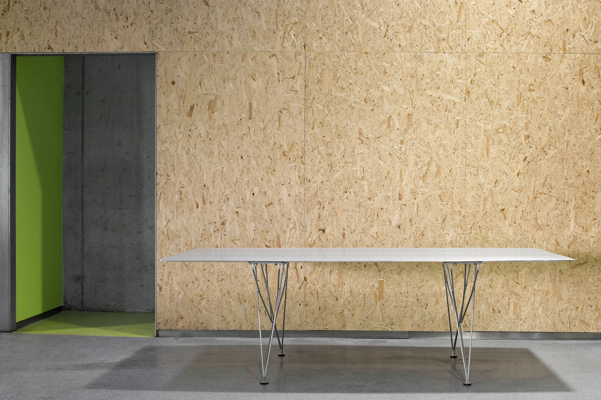 Table B是由 Konstantin Grcic 为BD Barcelona设计的Extrusions系列产品之一。它的设计如同它的名字一样简单又满含工艺感,简单的外观背后隐藏着需要资深工程师参与的复杂工艺。桌面采用挤制铝材技术使剖面最小的同时长度可达到500cm。桌面的侧面留有45度开放式凹槽并可选择将桌面以层压技术打造自然的漆面橡木效果。桌腿除透明漆面的橡树木外还有两种设计可选:分别是灰色的不锈钢和工业混凝土。多种选择使桌子适用于室内和室外。