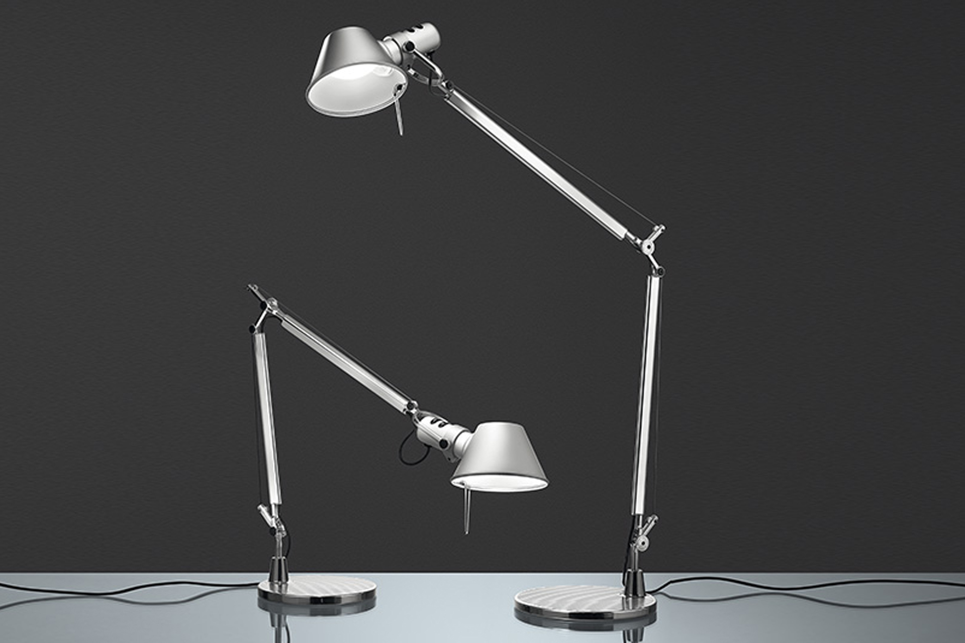Michele de Lucchi与Giancarlo Fassina于1987年为Artemide设计的Tolomeo系列灯具,包括台灯、壁灯、吊灯、立灯和书夹灯。这组灯几乎是八十年代高科技完美风格的象征。台灯如同一个张度很大的圆规,轻便的铝制灯臂能随意移动光源,它可以变成绘图用灯和台灯,或根据用户的需要来照明环境。
