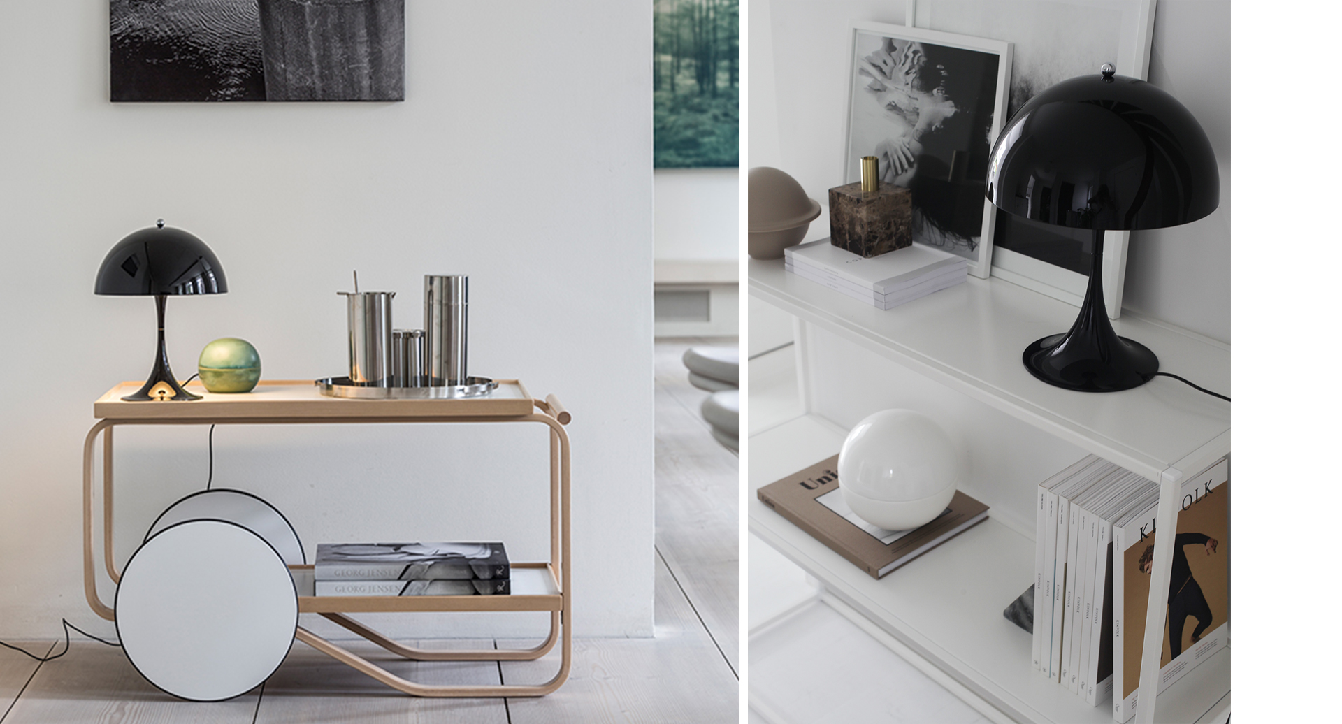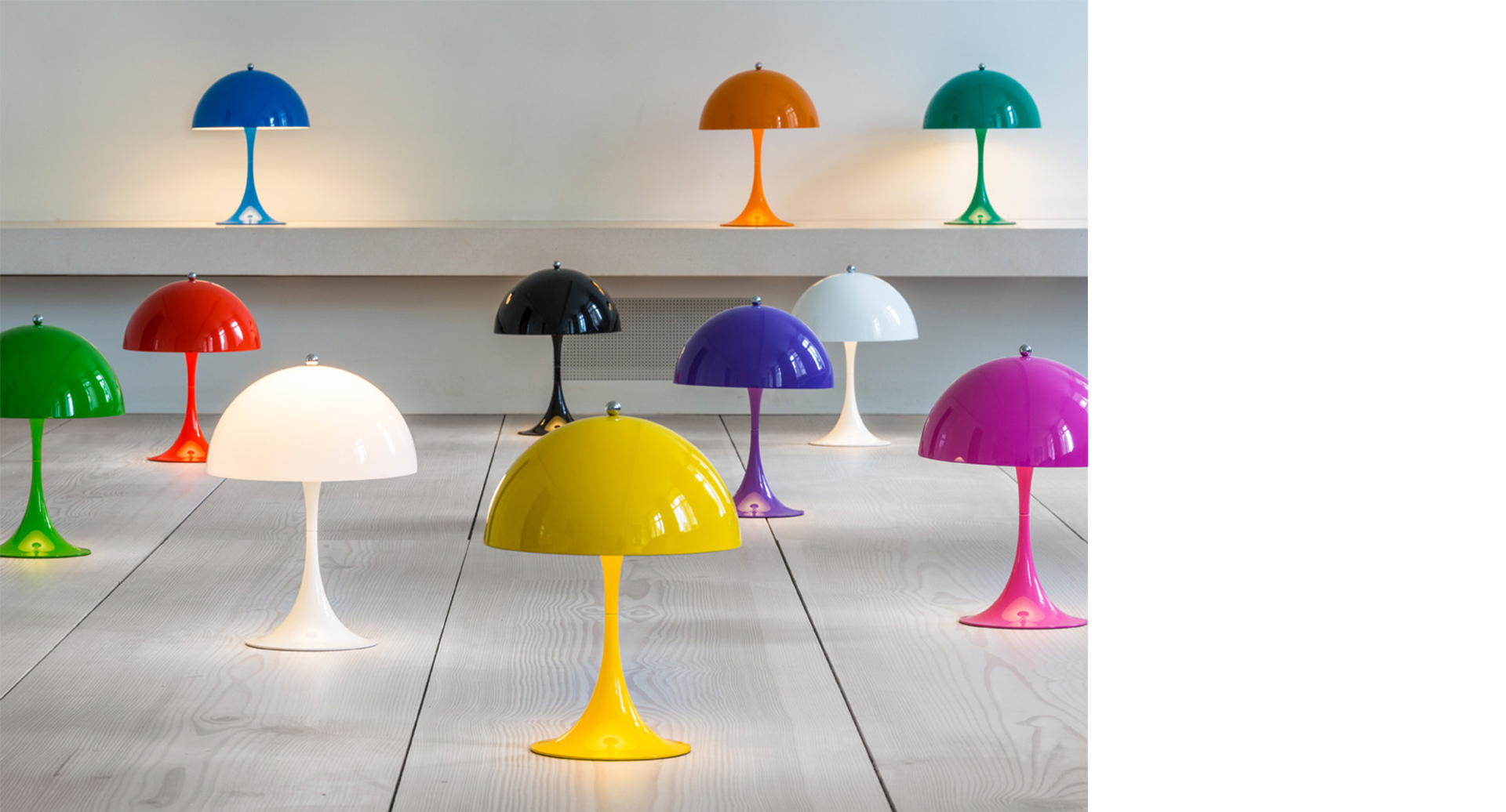 Verner Panton 1971年设计的Panthella系列桌灯,落地灯,丹麦品牌Louis Poulsen 出品。桌灯底座既可作为固定使用,同时也可作为反光部分,光源隐藏在奶油白色亚克力灯罩里,喇叭形底座反射光同时增加整个灯具的美感。落地灯搭配苗条的灯杆,简洁古典。