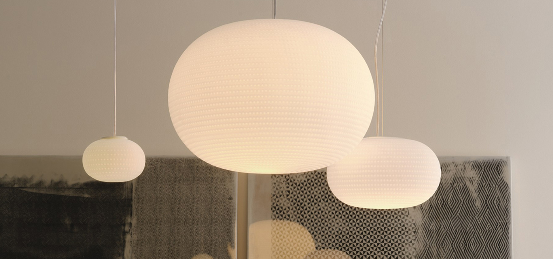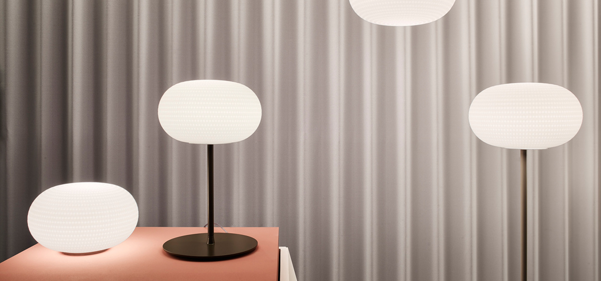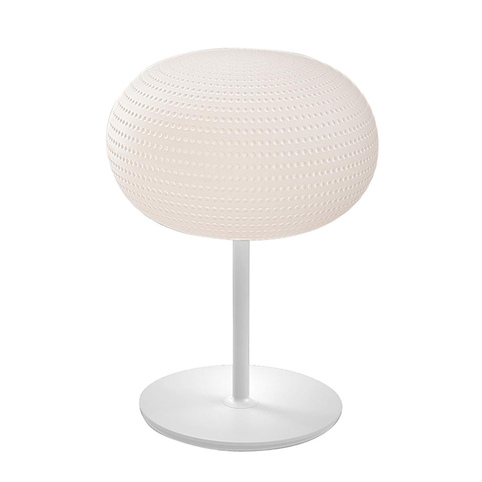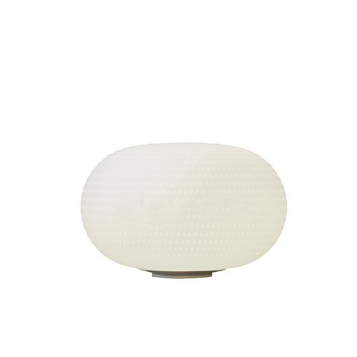 由Matti Klenell为FontanaArte设计的Bianca系列配备了固定铸模吹制的带有乳白色缎面罩的玻璃扩散器。扩散器表面的装饰特点是在白玻璃上蚀刻出一系列有序的浅而精致的凹槽,产生一种类似于新鲜积雪上的小脚印的效果。