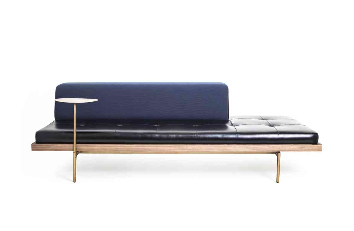 纪律沙发,木制平面作为四种软垫的基础。由精致的金属支腿支撑,平台悬浮在地面上方,其简单的几何形状和精心校准的尺寸可实现各个单元的无缝聚合。沙发的变体可以无限配置组合,用于各种功能,从紧密的两件式“L”到20米长的长凳,甚至背对背摆放成为独特的陈设。