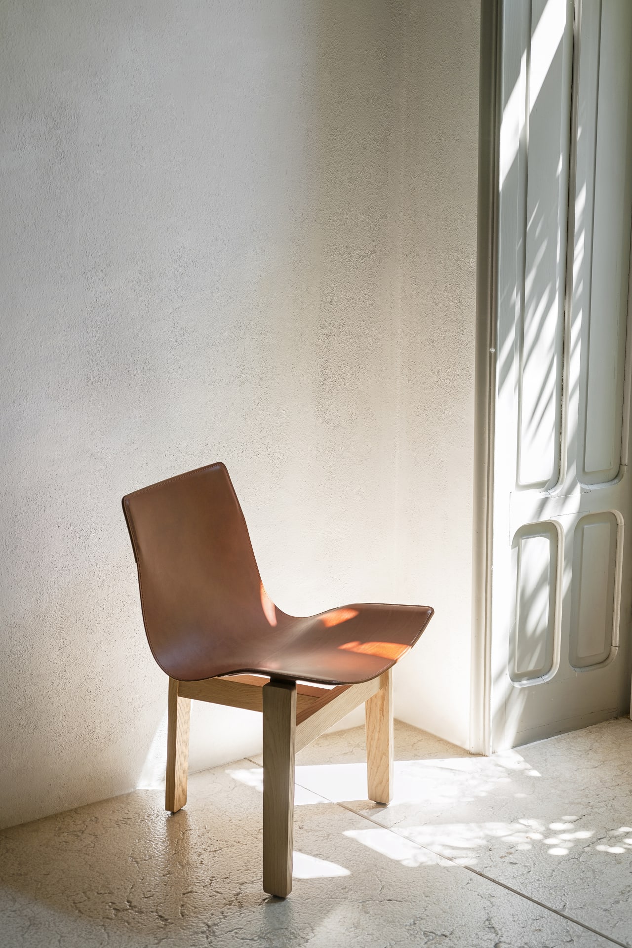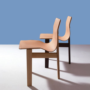 A comfortable chair made of traditional materials like wood and leather featuring simple but elegant construction details. A stool with three rectangular-sectioned legs, two front legs at the sides and a central leg at the rear, joined together by a solid T-shaped cross structure, which is as stable as a traditional chair with four legs. In Tre 3, a piece of leather has been placed in the high rear leg which gently descends to smoothly and seamlessly give shape to the back and seat. This is a rereading of a kind of chair previously created by leading figures of Nordic design.