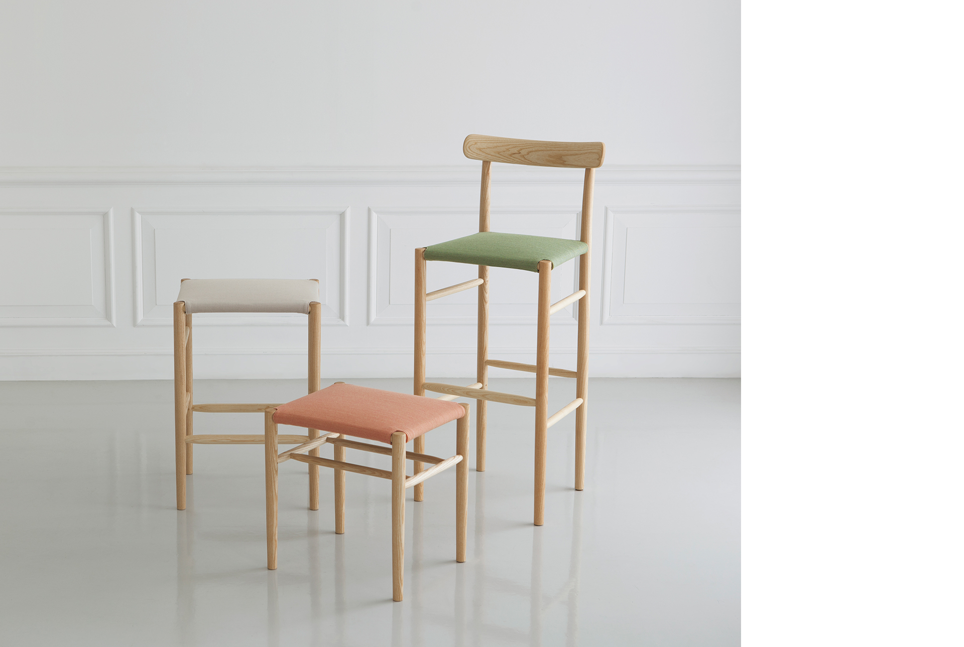 由Jasper Morrison为日本制造商Maruni设计的T Bar Stool在2016年的米兰家具展上亮相,为设计师旗下的家具产品再添一员。T Bar Stool采用3D木材加工技术,座椅、腿和靠背均由枫木制成,表层涂有透明的聚氨酯涂料。彩色弹簧钢带连接座椅和靠背,为一定程度的活动提高了舒适度。钢材的使用与木材也形成另一种对比。