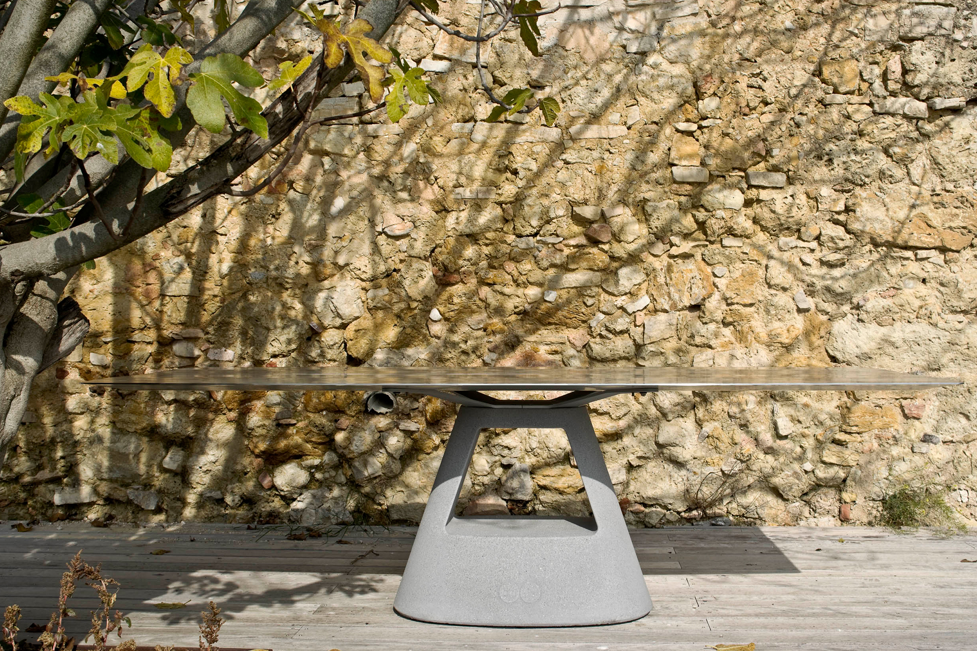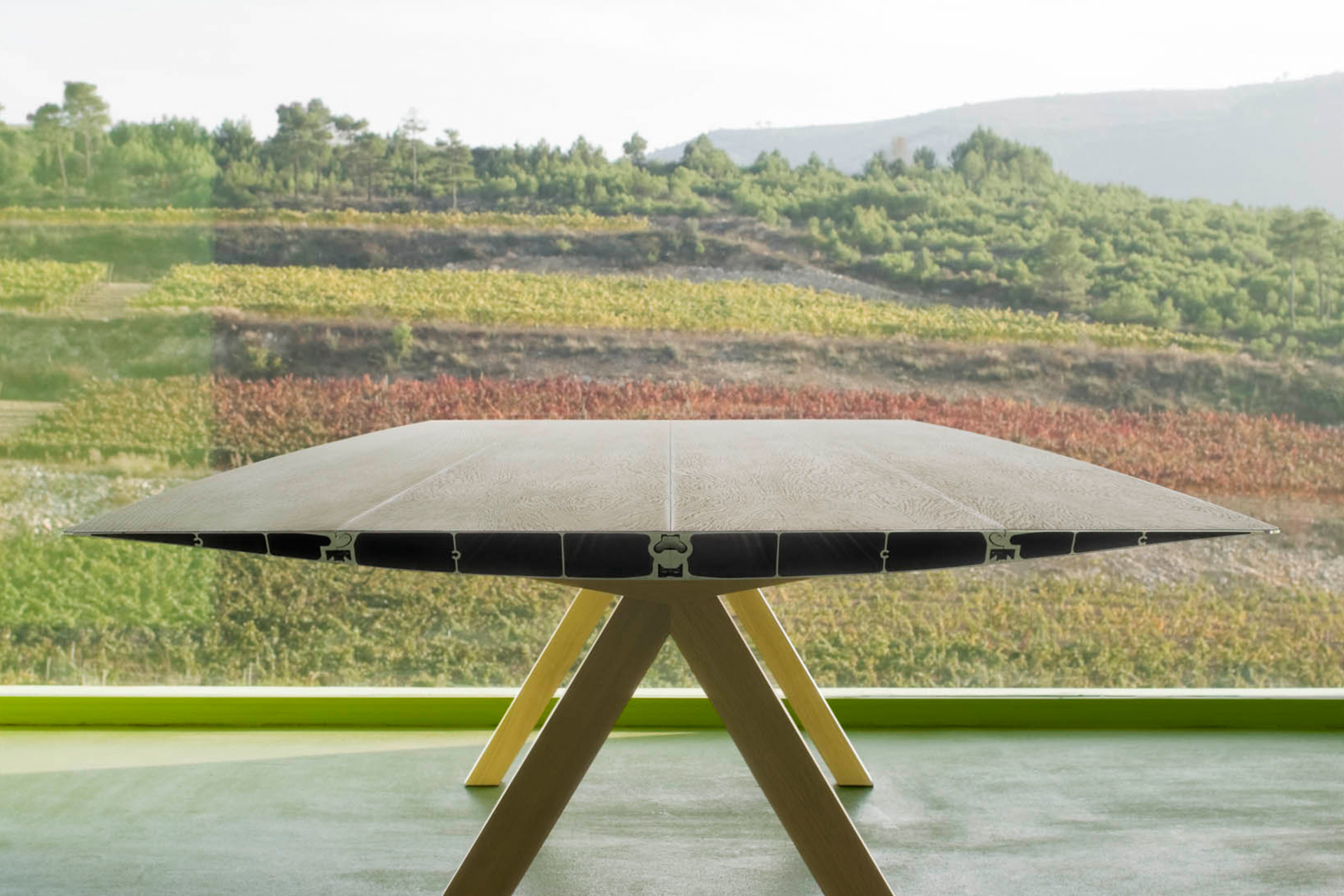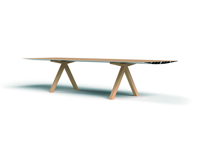Table B是由 Konstantin Grcic 为BD Barcelona设计的Extrusions系列产品之一。它的设计如同它的名字一样简单又满含工艺感,简单的外观背后隐藏着需要资深工程师参与的复杂工艺。桌面采用挤制铝材技术使剖面最小的同时长度可达到500cm。桌面的侧面留有45度开放式凹槽并可选择将桌面以层压技术打造自然的漆面橡木效果。桌腿除透明漆面的橡树木外还有两种设计可选:分别是灰色的不锈钢和工业混凝土。多种选择使桌子适用于室内和室外。