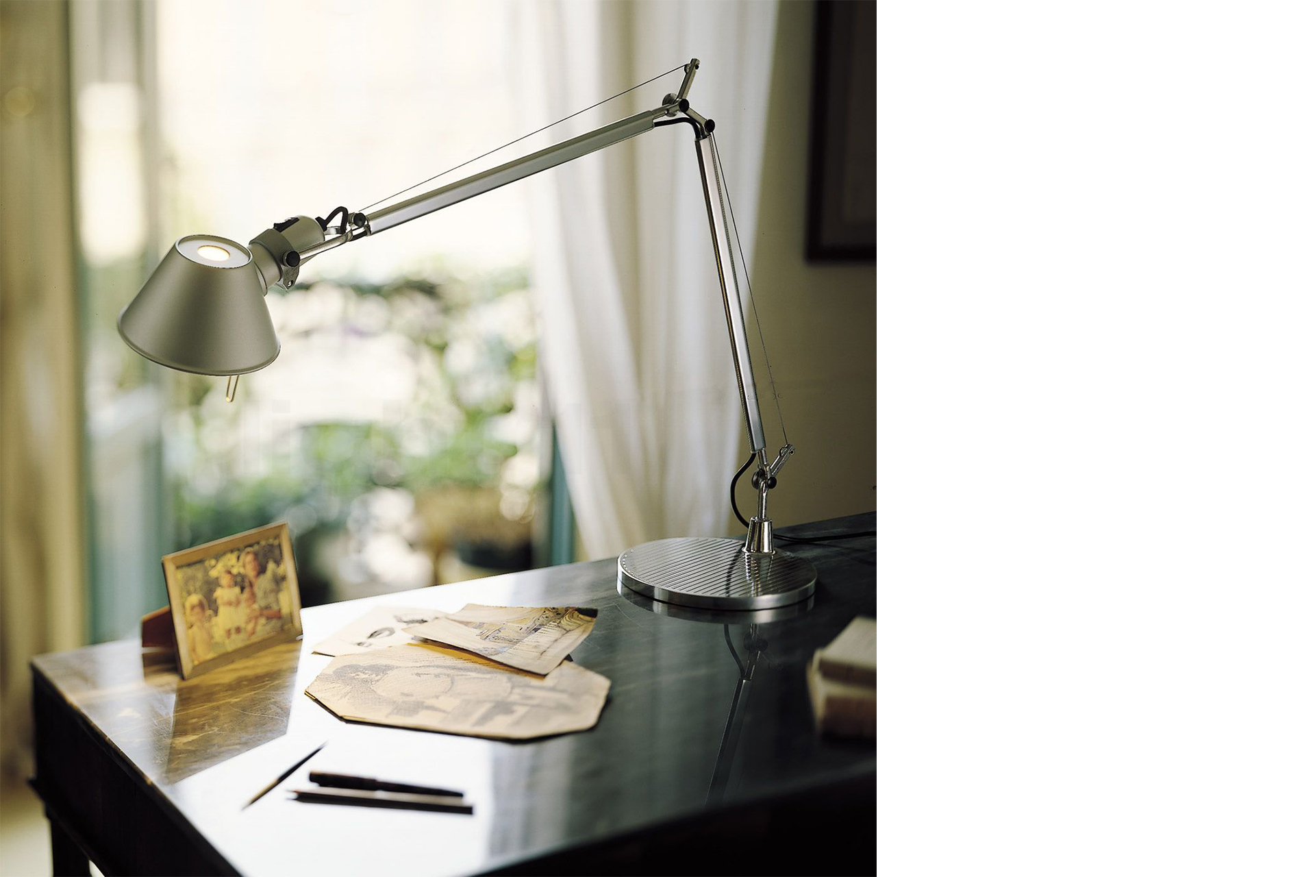 Michele de Lucchi与Giancarlo Fassina于1987年为Artemide设计的Tolomeo系列灯具,包括台灯、壁灯、吊灯、立灯和书夹灯。这组灯几乎是八十年代高科技完美风格的象征。台灯如同一个张度很大的圆规,轻便的铝制灯臂能随意移动光源,它可以变成绘图用灯和台灯,或根据用户的需要来照明环境。