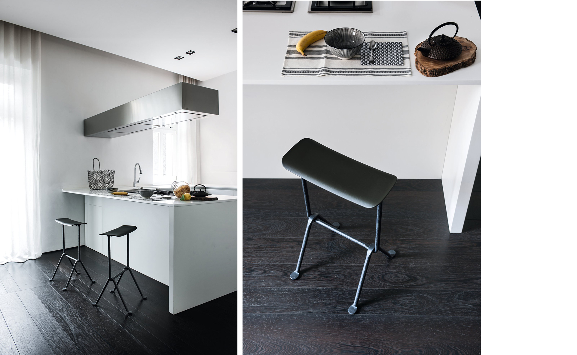 锻铁,是历史上最古老的技艺之一,即用铁锤打磨和雕刻生铁。对于Magis的Officina系列来说,Ronan & Erwan Bouroullec意图重现这门传统古代工艺,同时给予它一种全新的视觉效果。创新式几何形状的支架结构正是这一理念的产物。锻铁的材质可以打造极为复杂却又精致的家具,其富含生命力而又有些许瑕疵的表面,赋予物体一种特殊的感染力。通过展现随机的塑形痕迹,这些产品为量化复刻生产的家具工业带来一缕生机。