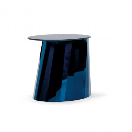 底座由折叠、高光抛光不锈钢板制成,颜色不同,采用特殊方法着色。椭圆形桌面由水晶玻璃制成,彩色漆面,有光泽或有装饰。