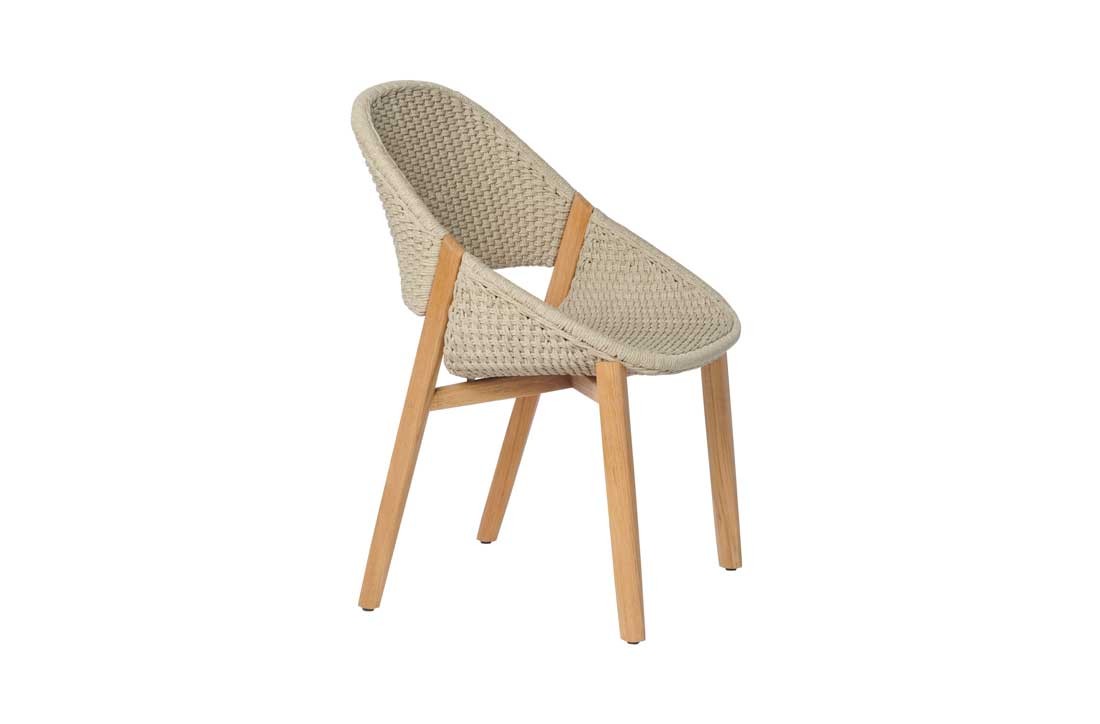 Elio, referring to the Greek sun god Helios and designed by Canadian design firm Yabu Pushelberg, is inspired by the motion of light as it reflects and refracts on landscapes and objects. Multiple soft shades of yarn are woven into one strand, which mimics the hues of natural light and makes each chair unique. The handwoven seat in weather-resistant Tricord rope, draws inward to create a warm, intimate cocoon effect. The chair, perfect for relaxed dining, is framed by natural teak, which supports the seating shell primarily through the back legs that cross the shell.
